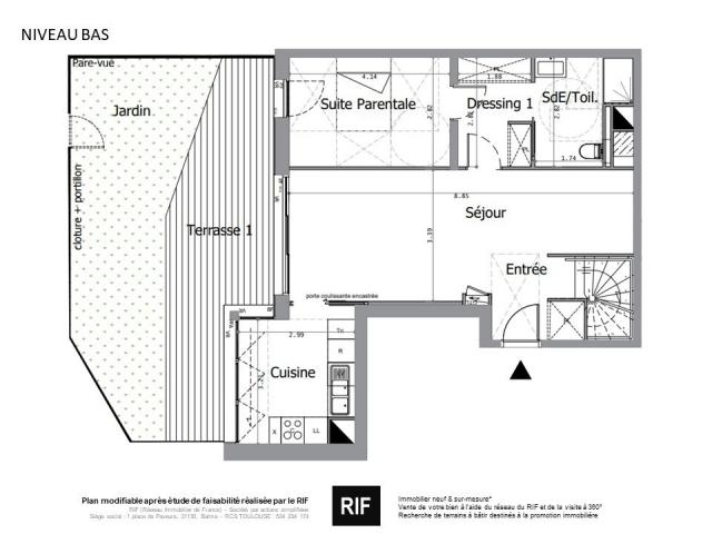 Particularités : bien agencé, séjour (25 m²) ouvert sur terrasse, prestations de qualité, dernières normes thermiques et phoniques.